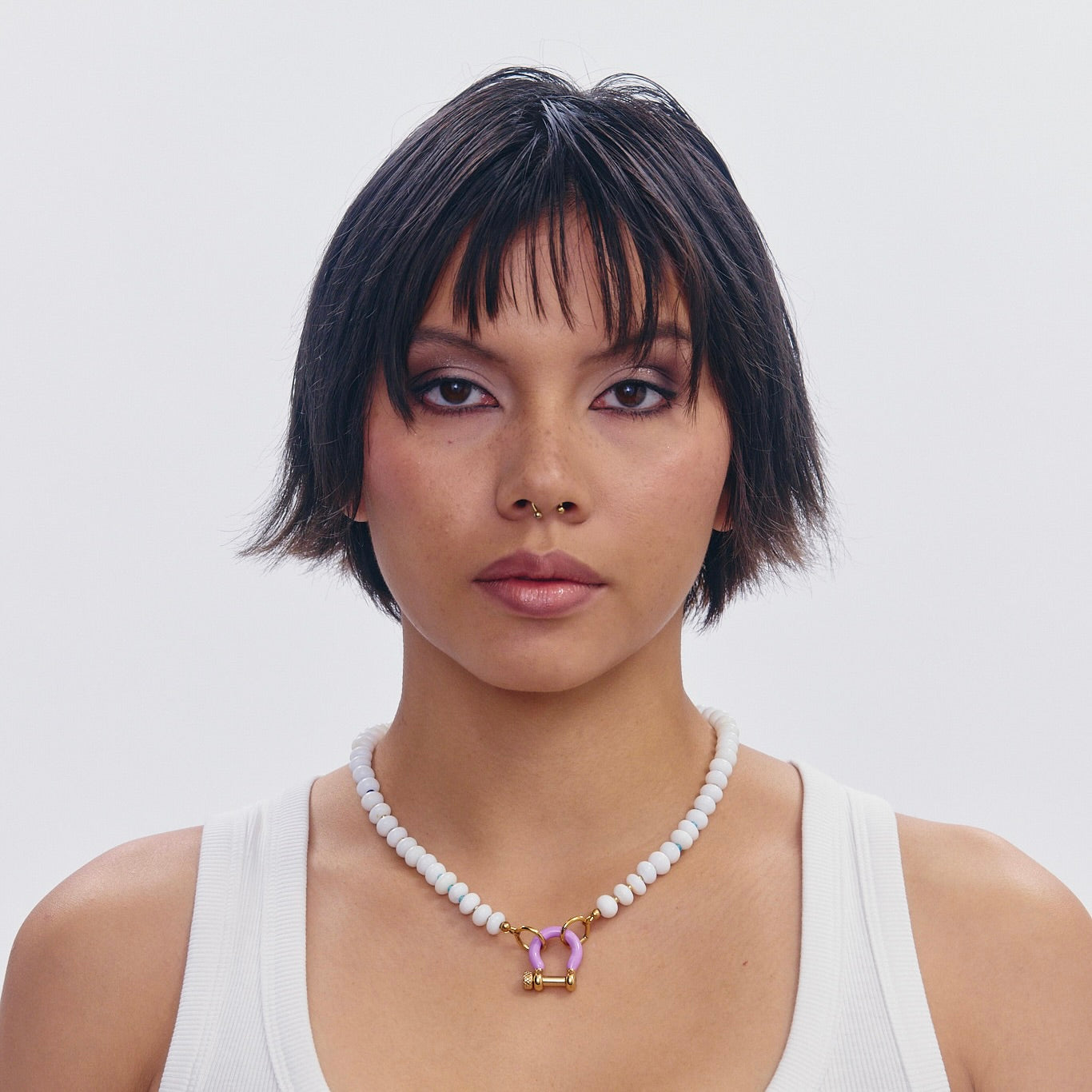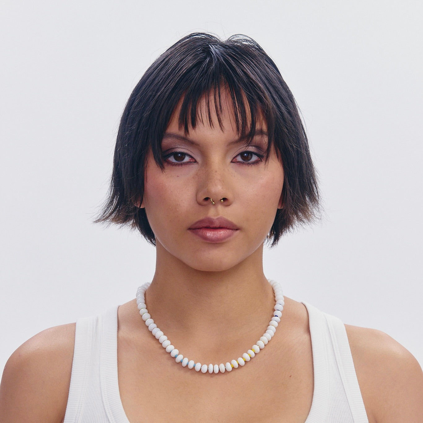 17 inch opal necklace with 14 karat gold plated hardware and enamel carabiner