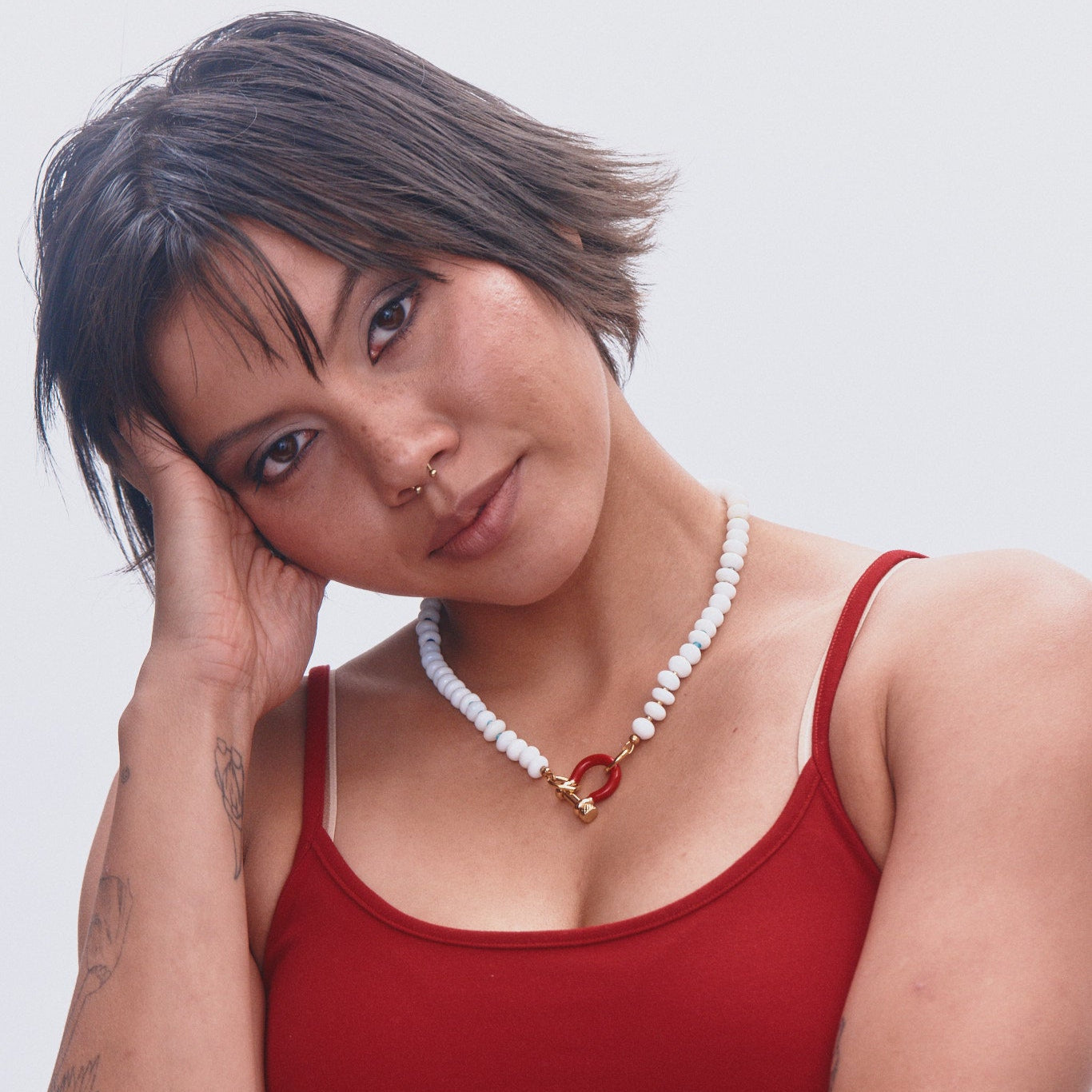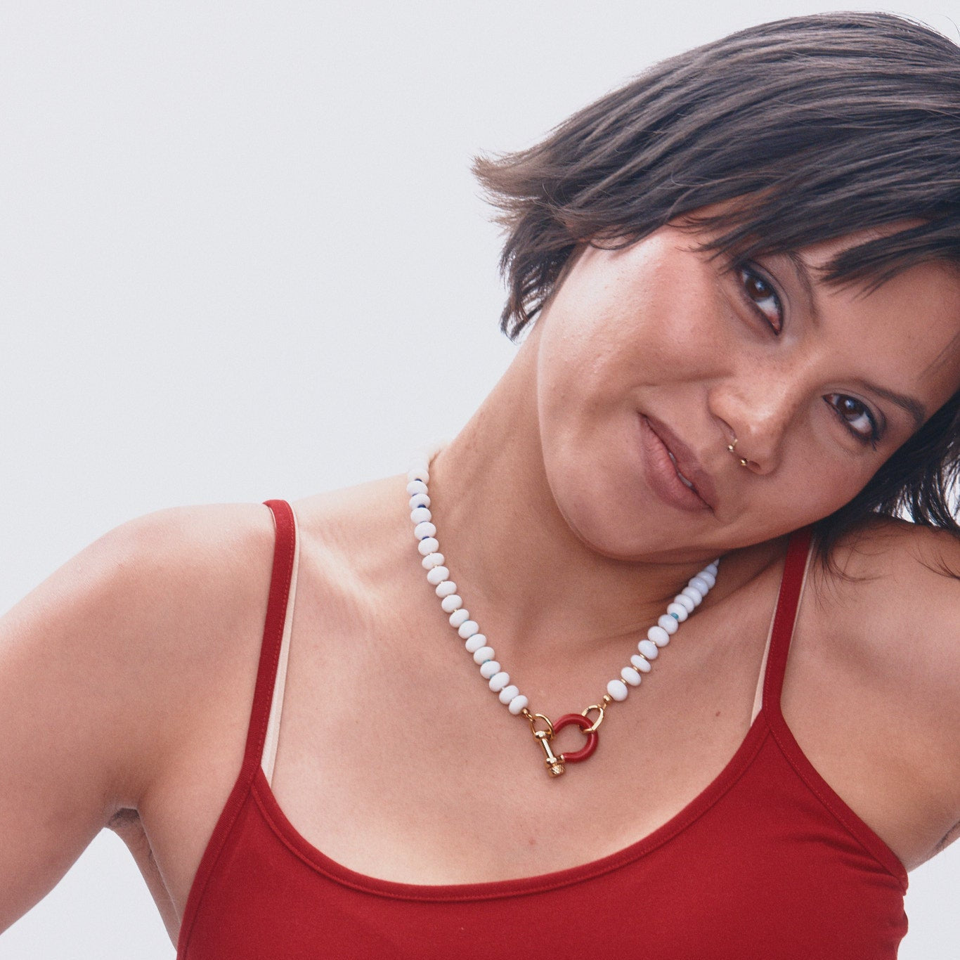 17 inch opal necklace with 14 karat gold plated hardware and enamel carabiner University of Alabama